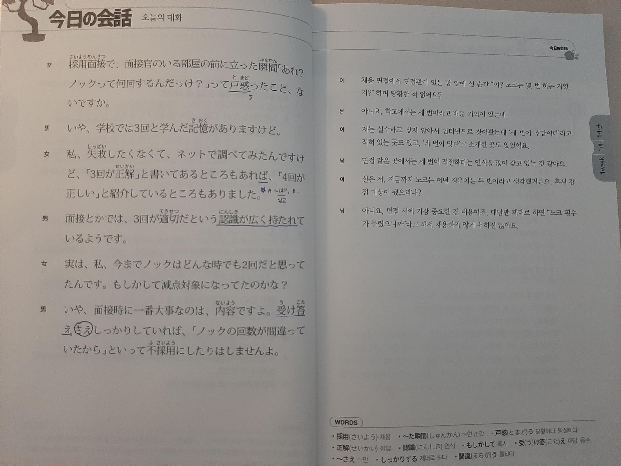 필요한 단어들을 넣어야 하다보니 일부러 이런 내용을 넣은 거겠지만, 제목부터 일본인의 그 의뭉스러움이 잘 느껴졌달까. 도대체가 <면접에서 입실할 때 노크는 몇 번?> 이라니. 예습하면서, 내가 옛날 교재를 잘못 산 건가 싶어 리얼로 출판년도를 다시금 확인했다.